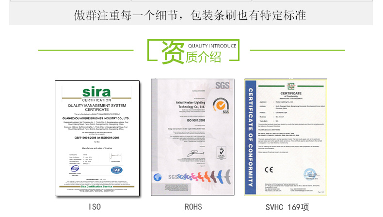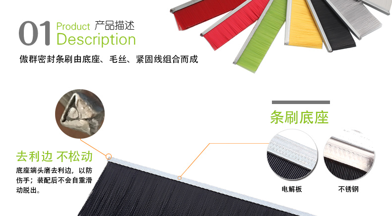 阻燃条刷的是由毛丝、底座、紧固线经过先进仪器压制而成的一种条刷产品,其底座可采用不锈钢、电解板材质。傲群条刷的毛丝可附加阻燃功能,阻燃等级可分为由 HB,V-2,V-1 向 V-0 逐级递增,我司产品已达到 Vo 最高级别的技术要求。另外其毛丝具有柔软、回复力好,耐磨性好等特点,并通过了UL-V0的SGS测试,常应用在机械、门底、机柜、扶梯等行业。